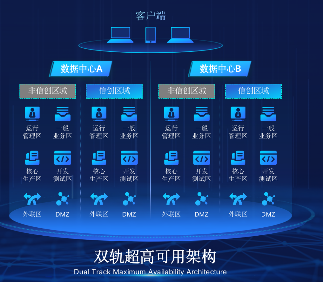 大成基金管理有限公司在企业面临自主创新IT基础重构过程中,推出的全新架构双轨超高可用架构(简称DTMAA),在双活数据中心的分区调度基础上,添加每个数据中心内信创域和非信创域的分域调度,来实现分区分域协同的多活双轨超高可用。